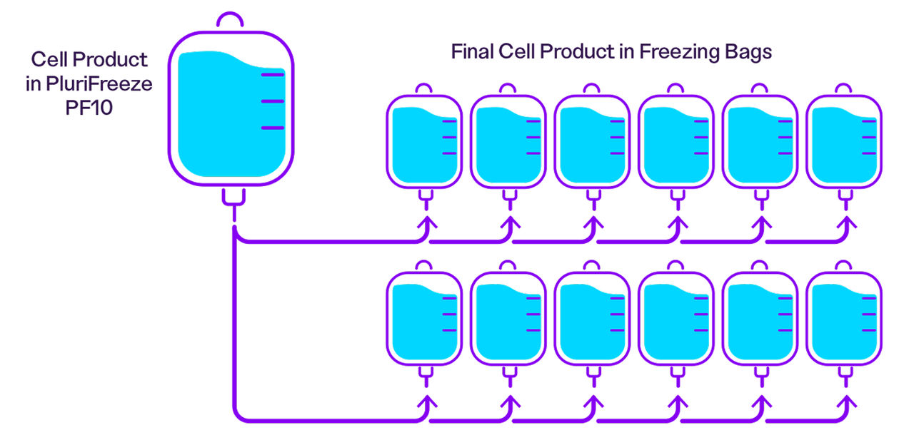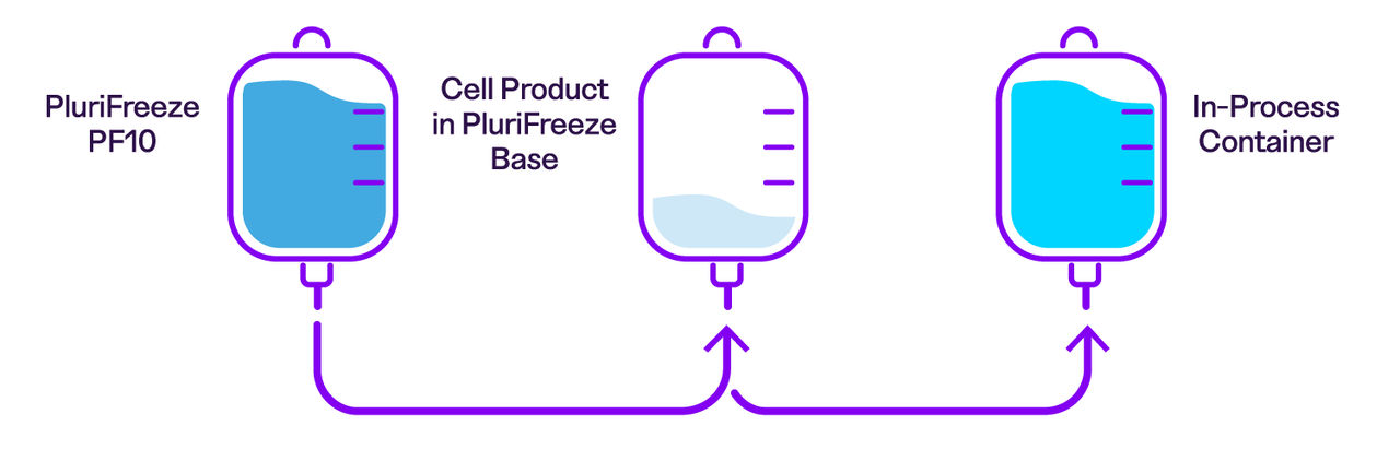 While we recommend using both products together, PluriFreeze Base can also be used independently during cold-hold steps in your workflow. The figure below illustrates where PluriFreeze Base and PluriFreeze PF10 fit within a typical cell therapy manufacturing process.