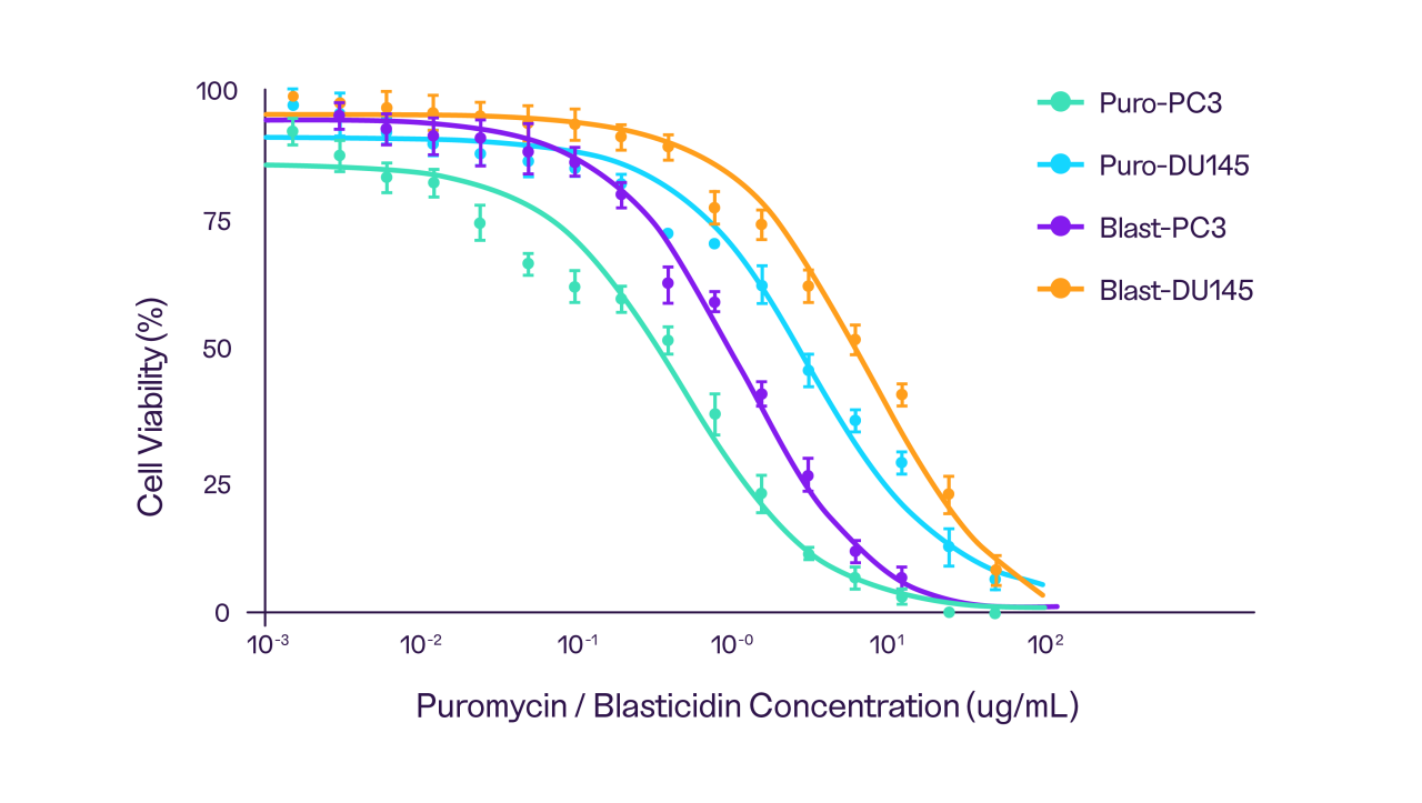 The antibiotic kill curve is a dose-finding experiment in which mammalian cells are exposed to increasing concentrations of an antibiotic to determine the lowest and the most effective antibiotic concentration that kills the untransfected cells. To make a kill curve, typically, untransfected cells are plated in a 96-well plate at a low density so that on the day of antibiotic treatment, they reach ~50% confluency. Following the recommended concentration range for the antibiotic, the cells are treated at increasing concentrations in triplicates. The cells are then regularly observed under a light microscope over a 7- to 10-day period, replacing the medium every 2 to 3 days. Viable cells in each well are quantified directly (e.g., trypan blue) or indirectly (e.g., MTT, CellTiter Glo) and plotted against antibiotic concentrations to determine the lowest concentration effective at killing all the cells.